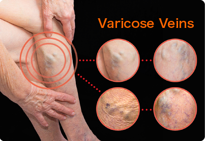 下肢静脈瘤で最も多いのは、ふくらはぎや太ももの血管が「コブ」のようにふくらんでいる状態です。良性の病気ですので、治療をしなくても全身の健康状態に深刻な影響をおよぼすことは少ないです。
